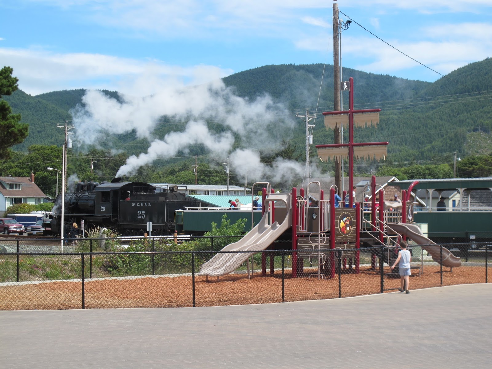 Nehalem Bay State Park to Cape Lookout State Park. 80kms. Tired and made a leisurely getaway to Cape Lookout. The aim was the Tillamook Cheese Factory en route so made quick work to Rockaway Beach where we had lunch and relaxed. The Girabaldi Steam Train arrived so we waited and then tried to see it go past on the return trip. To our delight it arrived and we managed to ride alongside it for about four kilometres which was such fun with the people waving and passing each other repeatedly. It was a lot of fun. Got to Tillamook and again it was overrun with tourists but the kids and I went in and it was really interesting and we got icecreams and sat outside and then went in for more cheesemaking viewing and then continued on our way.